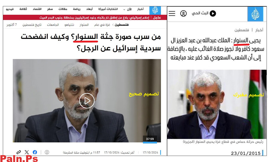تصميم خبري لموقع قناة الجزيرة، نشرته حسابات على موقع التواصل الاجتماعي إكس، حديثًا، يحتوي تصريحًا منسوبًا ليحيى السنوار قائد حركة…