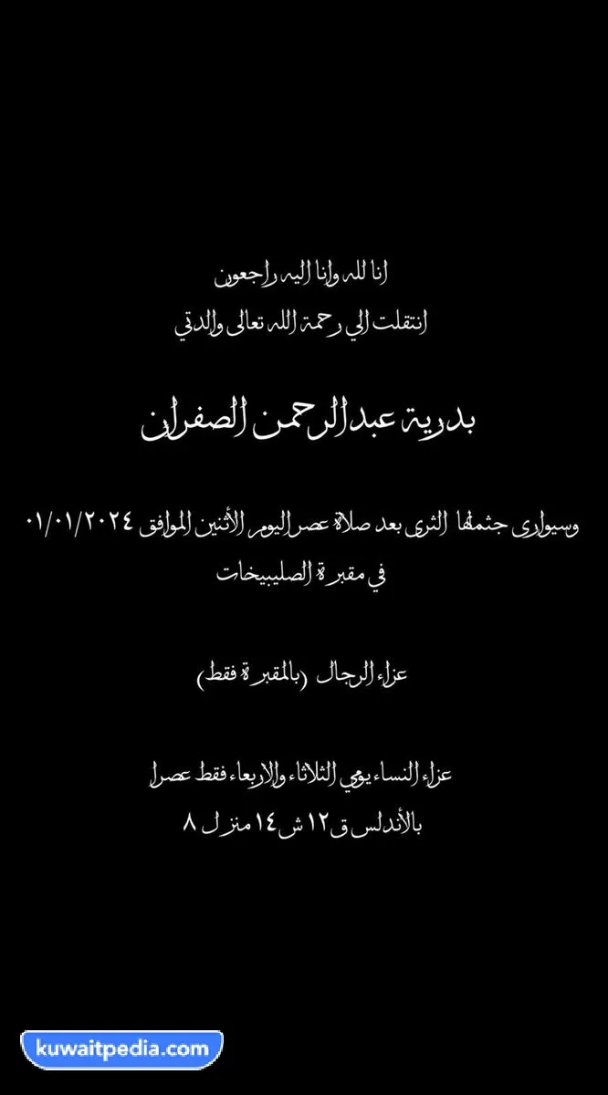 عمر السيدة بدرية عبد الرحمن الصفران وقت الوفاة غير معروف، وسيتم دفن جثمانها في مقبرة الصليبيخات بعد صلاة ظهر يوم الاثنين. علماً أن تعازي الرجال تقبل فقط في المقبرة، أما النساء فيمكن تقديم تعازيها خلال ساعات بعد ظهر يومي الثلاثاء والأربعاء. في الأندلس قطعة 12 شارع 14 منزل 8.